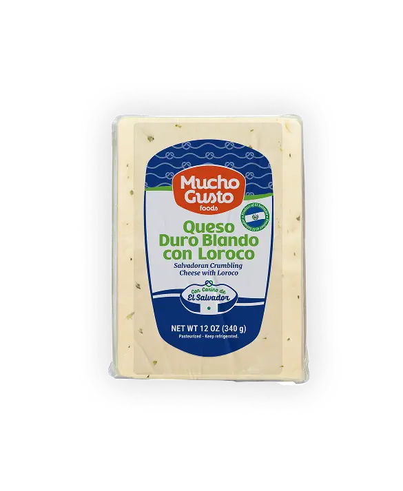 El Queso duro blando con loroco es un queso típico salvadoreño, duro de media humedad y de maduración media y sabor a leche ligeramente salado, su textura es firme y dura con partículas de loroco que le otorgan un aroma espectacular. -Elaborado con Loroco fresco / no congelado
